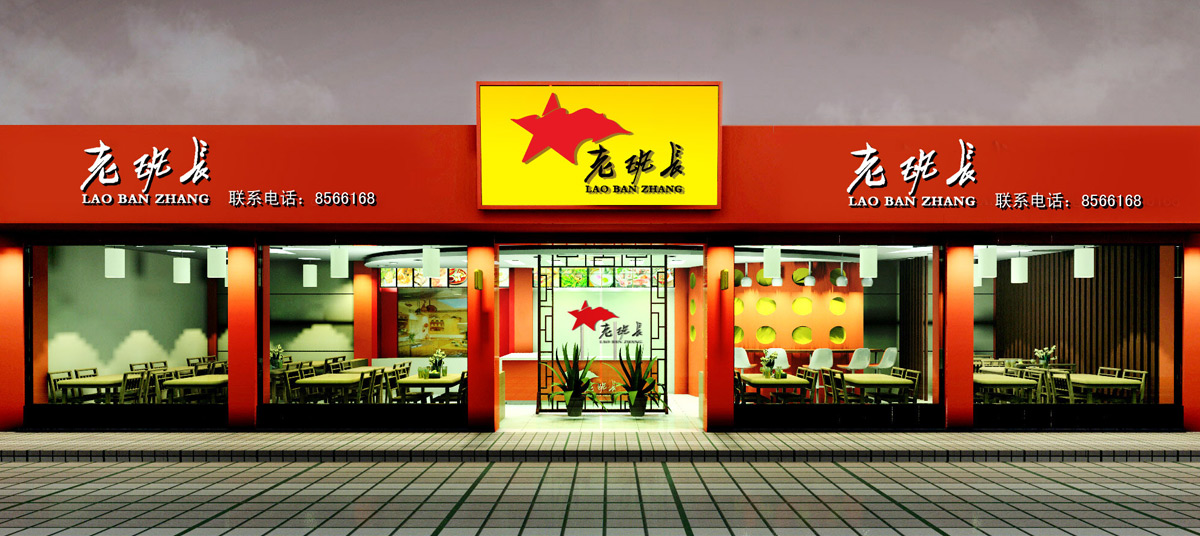 创建完备的旗舰店VI视觉识别系统,餐具系统、服装系统、店面用品、促销宣传系统/环境导向系统、店面灯箱招牌系统及室内外环境形象系统的顺利实施和同步导入,老班长品牌形象赢得顾客青睐,好评如潮。餐饮店空间设计各种各样,展示形式也不定向化,动态展示是现代展示中倍受青睐的展示形式,它有别于陈旧的静态展示,餐饮店店面设计采用活动式、操作式、互动式等。老班长店面设计以五角星为创意源泉,与“老班长”品牌内涵相吻合,以毛主席书法笔迹为基础,给人熟悉、信赖的品牌感受,老班长餐饮连锁以中餐为主营方向,以树立膳食营养平衡及健康饮食方式为特色以及个性的管理方式;依据其特色的膳食配方及特色的经营模式以及标准化的操作流程,开创中华饮食特色新典范。